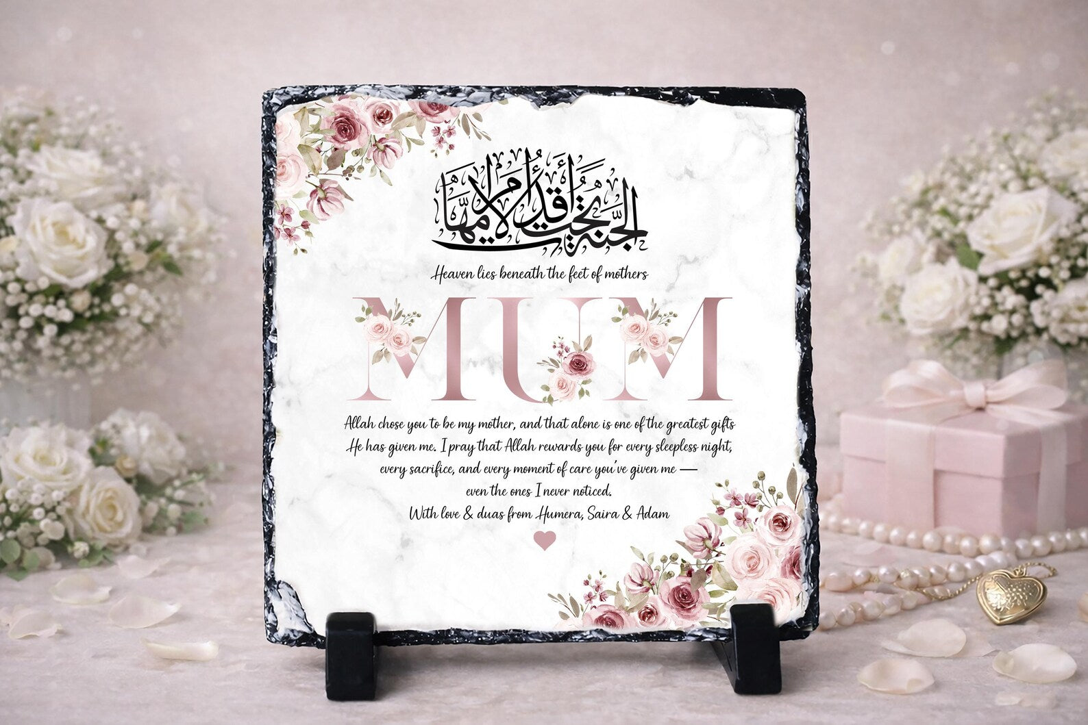 This elegant Rock Slate Mother’s Day Plaque features the beautiful Arabic calligraphy of: