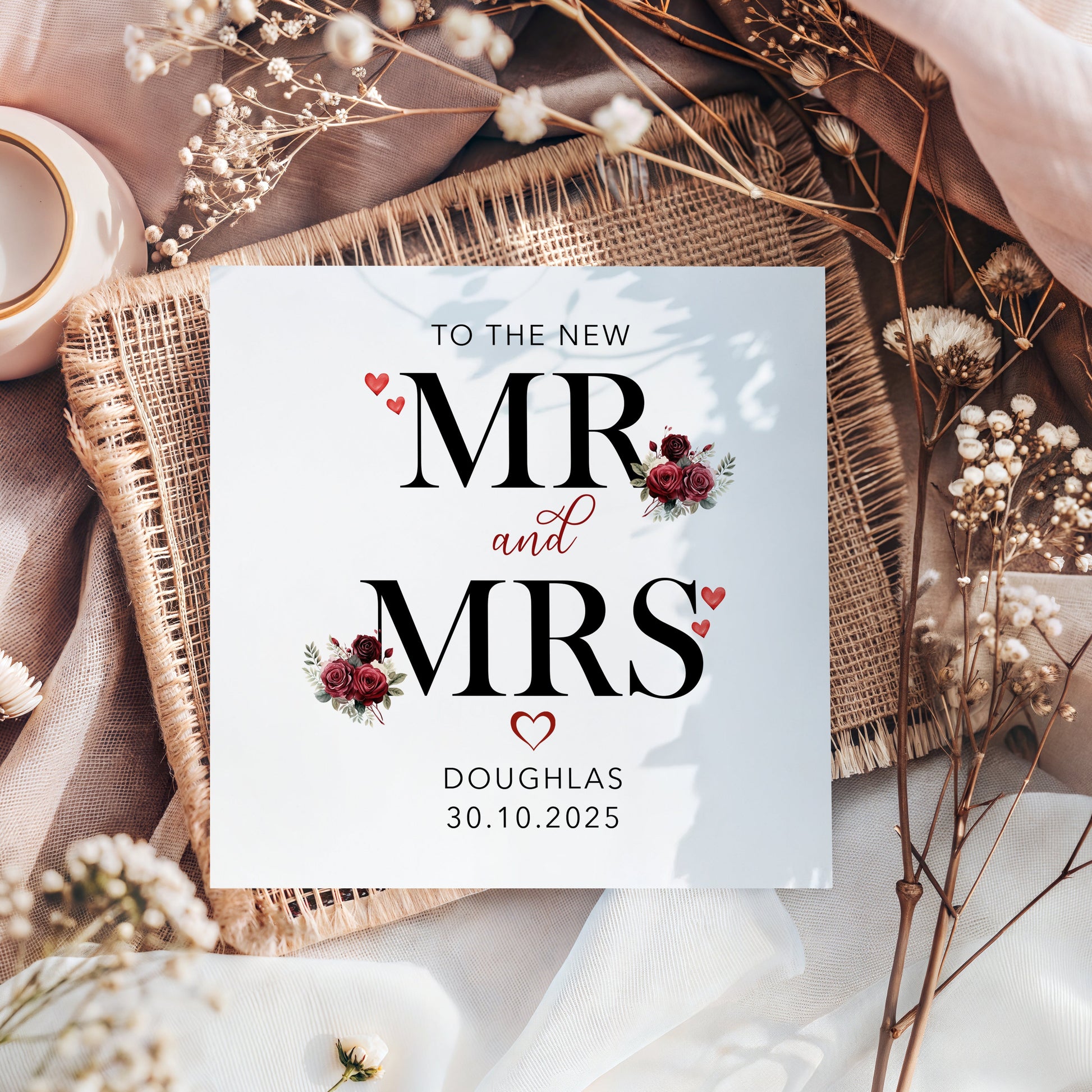 Celebrate love with this elegant Mr & Mrs personalised card featuring a timeless Floral Red alphabet design with delicate floral details. Perfect for weddings, anniversaries, engagements, or as a thoughtful keepsake for newlyweds.